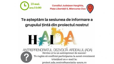 Vrei să devii antreprenor în regiunea Centru? Ai domiciliul sau reședința în județul Harghita? Poți afla cum îți poți îndeplini visul la evenimentul nostru de la Miercurea Ciuc, miercuri 23 mai, ora14.00, la Consiliul Județean Harghita. Înscrierea este gratuită în limita locurilor disponibile prin email la adresa proiect.ada.centru@asociatia-asura.ro.