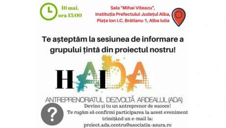 Pe 16 mai are loc la Instituția Prefectului Alba un eveniment de informare a grupului țintă: persoane cu domiciliul sau reședința în regiunea Centru. Puteți afla cum puteți beneficia de cursuri gratuite de formare a competențelor antreprenoriale și cum puteți obține o finanțare nerambursabilă pentru o afacere non agricolă în regiunea Centru. Înscrieri la: proiect.ada.centru@asociatia-asura.ro.
