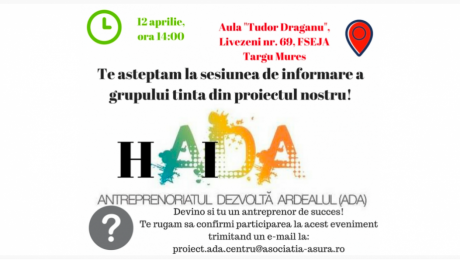 12 aprilie 2018, în Aula Tudor Drăganu a Facultății de Studii Economice, Juridice și Administrative din Târgu Mureș, strada Livezeni nr. 69. Trimite un email la proiect.ada.centru@asociatia-asura.ro și rezervă-ți un loc! Participarea este gratuită.