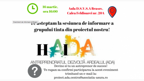 16 martie 2018, în aula D.S.V.S.A. Brașov, Calea Feldioarei, nr. 20A, începând cu ora 16:00. Trimite un email la proiect.ada.centru@asociatia-asura.ro și rezervă-ți un loc! Participarea este gratuită.