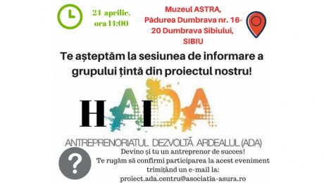 În data de 24 aprilie 2018, la Muzeul Astra din Sibiu, vă așteptăm să vă oferim mai multe informații despre oportunitățile de formare profesională gratuită și obținerea unui ajutor de minimis de până la 178.000 de euro nerambursabili. Înscrierea se face la email proiect.ada.centru@asociatia-asura.ro. Participarea este gratuită în limita locurilor disponibile.